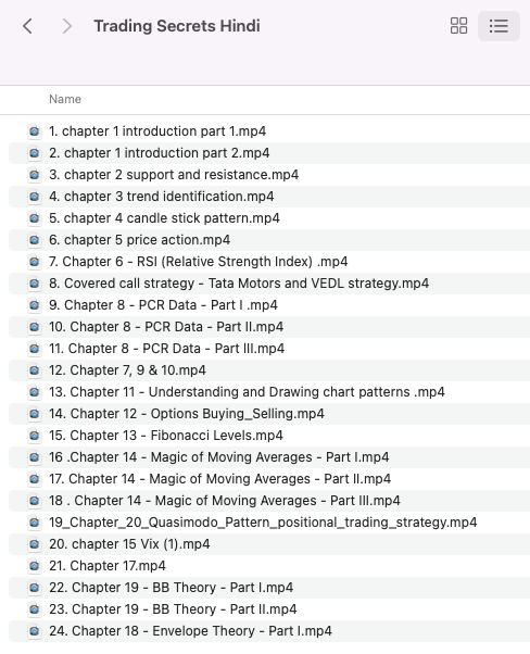 The Course has been designed to impart the basic knowledge towards understanding of market, ability to understand and apply the advanced trading strategies. Course will be covered under the following headings:- 1. Basics of Market Structure (a) Understanding the Indian Market (b) Nifty, Bank Nifty, Fin Nifty, other indices and their relevance (c) Understanding implications of foreign markets on Indian Markets (d) Understanding Worldwide events and their effects on Indian markets (e) Introduction to Futures and Options 2. Movement of market within Support & Resistance levels (a) How to identify Support & Resistance in multi TF (b) Horizontal Support & Resistance (c) Demand & Supply Zone identification and Secrets (d) Static and Variable Support & Resistance (e) Understanding Option Chain 3. Identification of Trends (a) Various types of Trends (b) Trend identification (c) Drawing Trendlines 4. Candlestick/Chart Patterns and their Relevance (a) Formation of Candles (b) Types of Candlestick Patterns (c) Psychology behind every candlestick pattern (d) Entering trade using candlestick patterns (e) Various types of Chart Patterns (f) Relevance of Chart Patterns in Multi TF 5. Identifying Price Action (a) Types of Price Action (Continuation, Reversal, Neutral) (b) Trading using Price Action method (c) Volume Analysis on Daily and Intraday Time frame 6. RSI (a) Study on RSI (b) RSI divergence/Convergence (c) Study on RSI crossovers (d) Relation with underlying derivative (e) Trading with the help of RSI (f) Identification of trend reversal with RSI (g) RSI relevance at different TF 7. Intraday Trading Strategy on 5/15 min charts (a) Inside candle Patterns on different TF (b) Previous days high/low (c) Market Static movement (d) Trading Gap up/gap down (e) BTST/STBT trading techniques (g) Stock Selection for Intraday 8. PCR data (a) Understanding relevance of PCR data (b) Identifying movement of market (c) Applying data wrt underlying derivatives (d) Understanding OI (e) Movement of market as per Multi Strike OI (f) Relevance of FII data (how to predict market as per FII data) (g) Predicting gap up/down (h) Understanding concept of profit booking and Shorts covering (i) Market vs PCR data (j) Relation with Chart Patterns in Multi TF 9. Capital Risk Management (a) Limiting the quantity and trades per day (b) Capital Management (c) Price Behaviour of the underlying asset (d) Relevance of fixing Target in Market 10. Relevance of time in the market (a) When to trade/book SL (b) When not to trade and save SL (c) Intraday movement of stocks as per PCR data 11. Understanding and Drawing chart patterns ADVANCE CHAPTERS 12. Options Buying/Selling (a) Buying/Selling – which is better and Why? (b) Introduction to Hedging (c) Option Selling & Option Buying (d) Introduction of Greeks used in option buying and selling (e) Uses of Sensibull, Opstra, trading Tick etc. 13. Fibonacci Levels (a) Relevance of Fib levels (b) Drawing and understanding Fib levels (c) Relevance of Fibonacci retracement and extension (d) How to use Fib in intraday trading (e) Uses of Fib in long/short term investing & swing trading 14. Magic of Moving Averages (a) Understanding relevance of Moving Averages (b) How to use MA in different TF (c) Identification of Stocks for long term, short term investing and swing trading (d) Intraday Trading Strategies (e) Relevance in all indices (f) Multi TF uses of MA (g) How to time Entry and Exit in stocks (h) Understanding foreign markets wrt MA (i) Gap Up/Down strategies 15. Volatility Index (VIX) (Trading Secret) (a) Understanding relevance of VIX (b) How VIX dominates the entire market (c) When and when not to trade as per VIX (d) Trading as per VIX (e) Determining future market movement (f) Relevance in multi TF 16. Relevance of Pivot Points and associated Trading Strategies 17. Intraday and Positional Futures and Option Strategy using MA, Pivot, RSI and VIX 18. Envelope Theory (Positional F & O trading strategy) 19. How to use Bollinger Bands in trading 20. Quasimodo Pattern positional trading strategy 21. Nifty and Bank Nifty F&O trading in Multi TF 22. Various option selling techniques 23. Option buying strategy in Nifty and BNF only 24. Uses of Super Trend in live market 25. Positional and intraday Option selling strategy in Nifty & BNF only 26. Introduction to taxation – LTCG, STCG, F&O. How to control taxes and repercussions if not done in right way.
